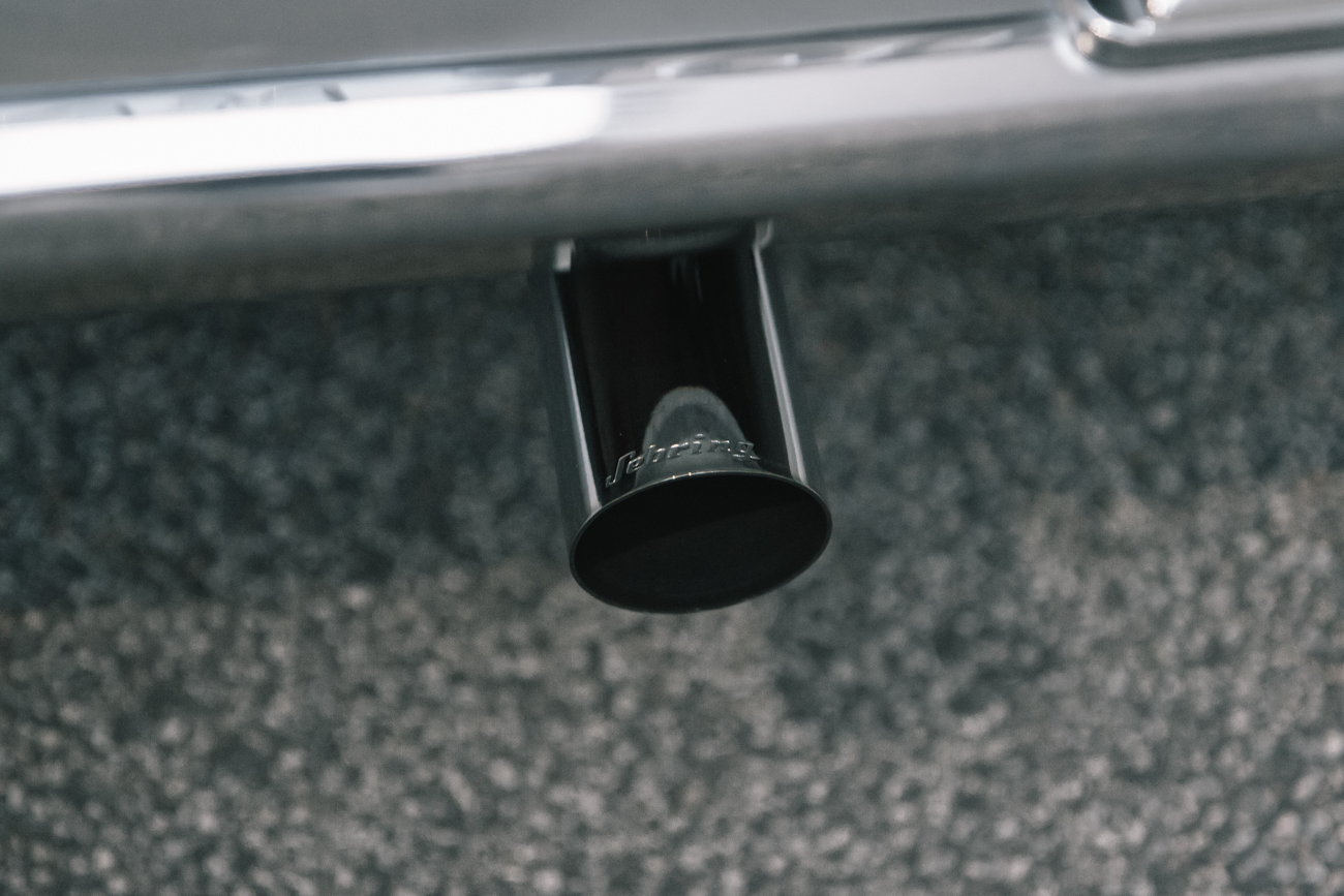 In the motorcycle world, they call them “cafe racers”. This is/was my idea for the car as well. I wanted to refine the car details and its overall look, making it special, but still keeping it time period correct. That said, I hunted down the original wood steering wheel and shift knob from back then. I basically kept to the period with original Lemmerz BMW alloy wheels adding a chromed finish on the edges to match the chrome moldings on the car. And I replaced the old (broken) muffler with a chrome Sebring sport exhaust system that sits in the middle to enhance the sporty look of the car — adding a deeper, more vibrant sound. This exhaust was first produced in 1969, offered as additional equipment. It’s period correct and doesn’t even have to be entered in the car’s records. The chassis placement on the right for the factory muffler was patched closed during the restoration process to make it look clean.