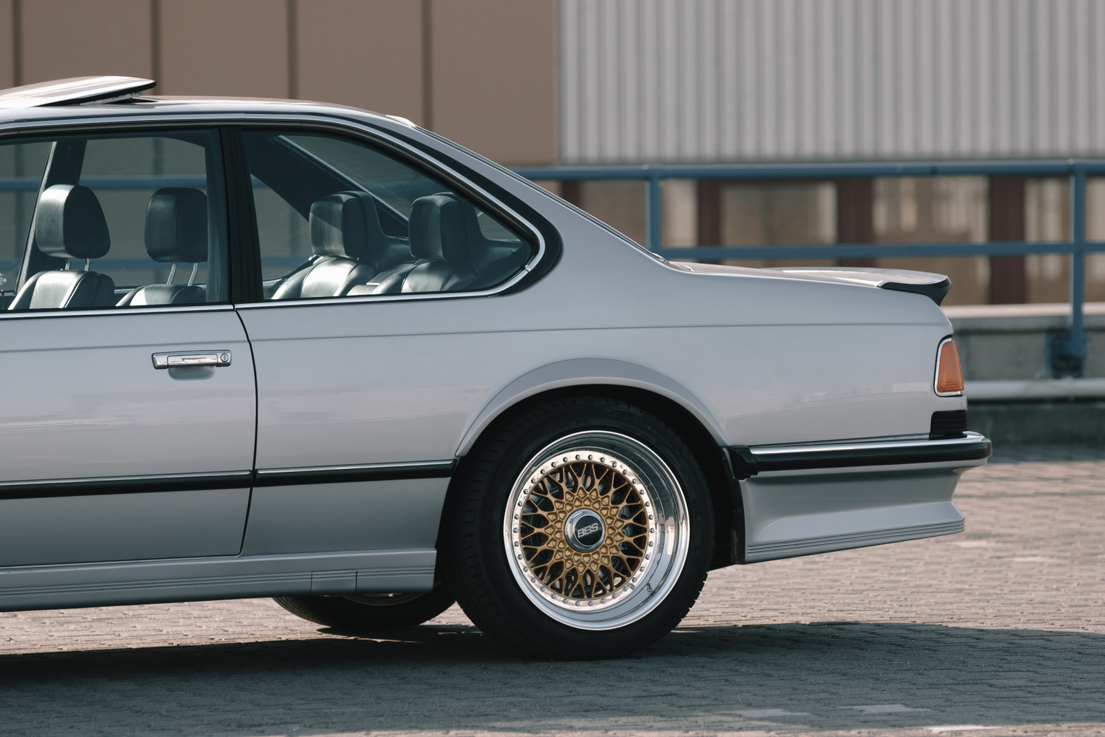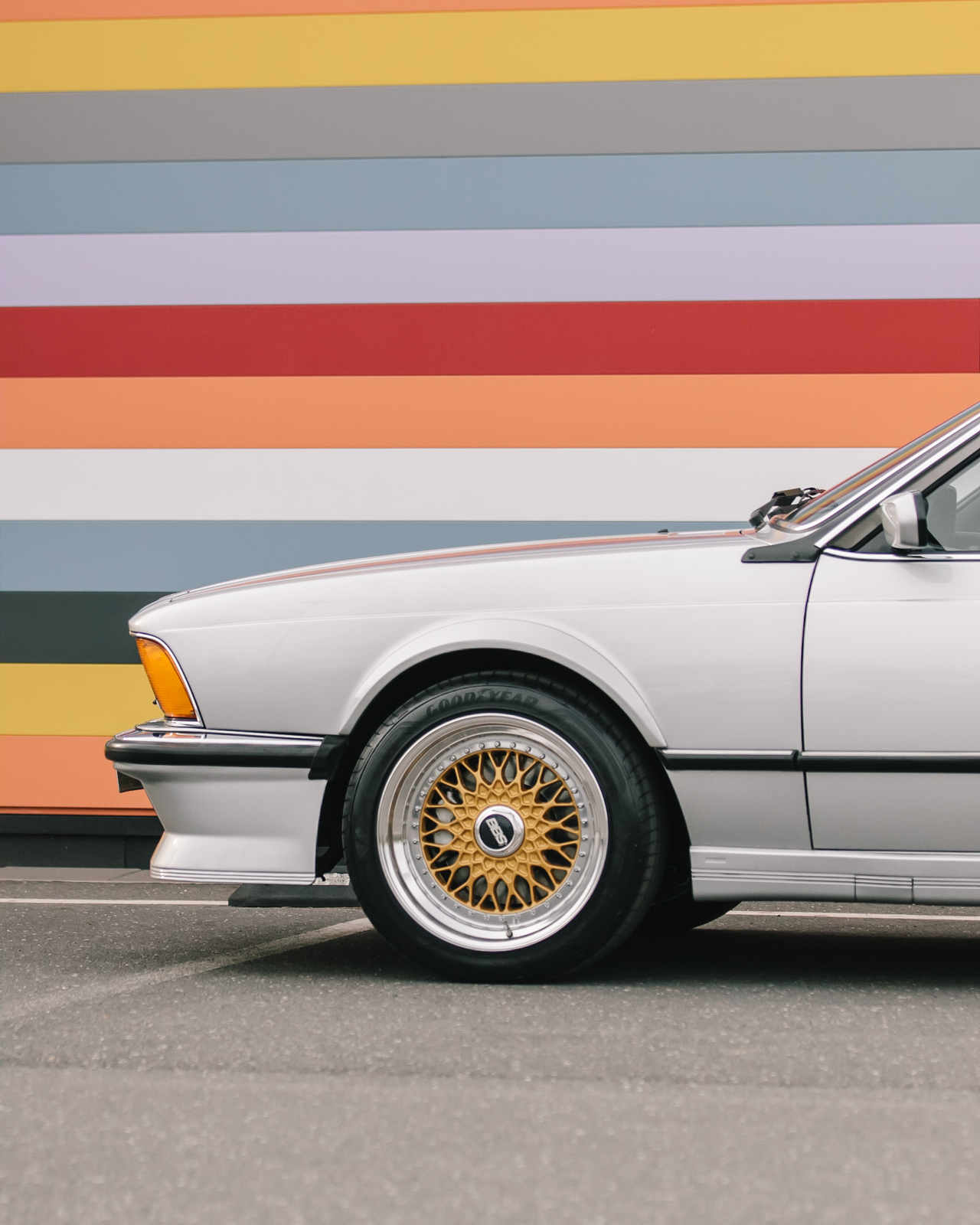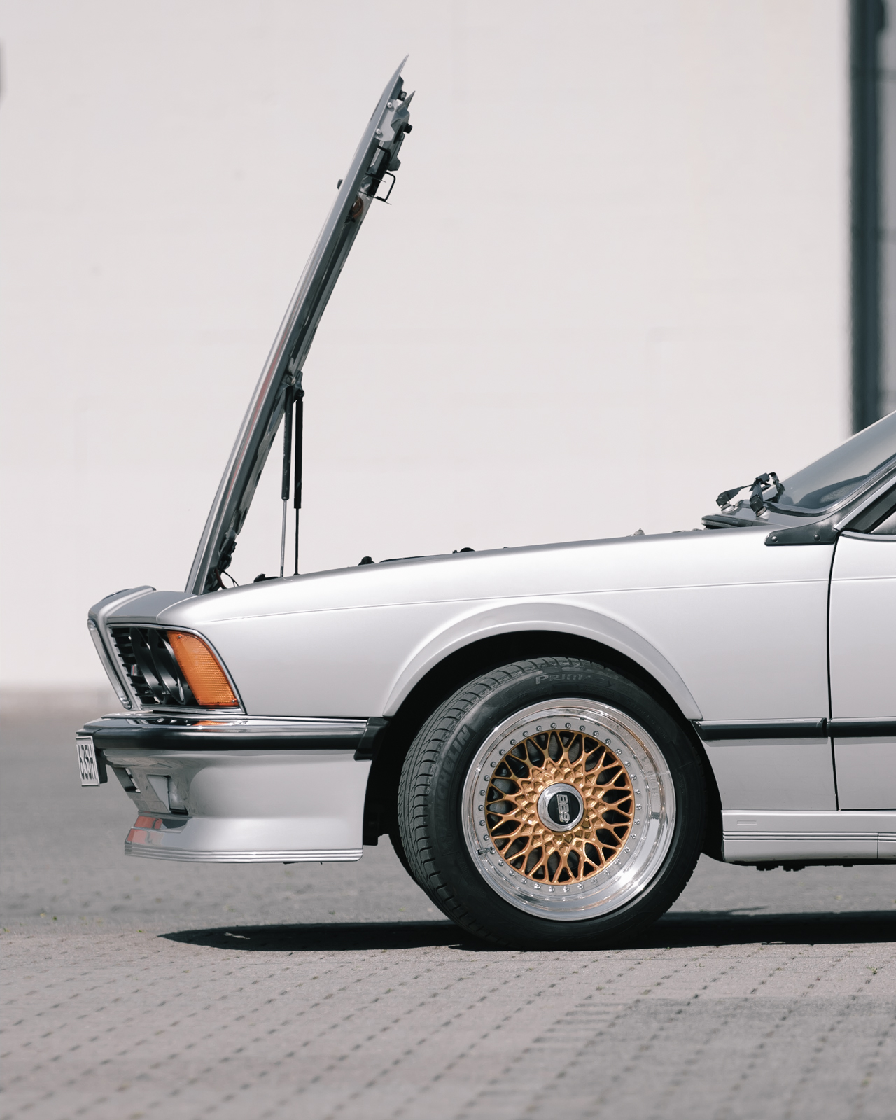Wheels are always crucial. It’s a kill or cure thing. These are rare original three-pieced 17“ BBS RS, powder-coated, with spacers. They fit the E24 much better than stock wheels, I think, and they’re design classics in their own right!