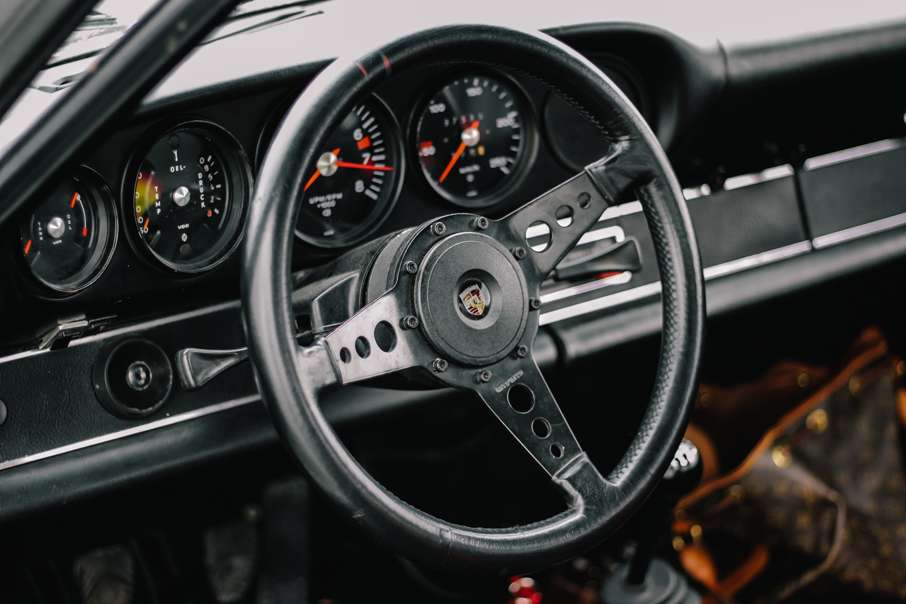 The 911 has received a lot of vintage factory parts. Its engine delivers 230 horses today. It´s a 2.4 S engine block modified in 2.7 RS with a lot of work on details. The 915 gearbox has also been modified with a short way, It has big four-piston brakes and larger discs with a hydraulic handbrake.