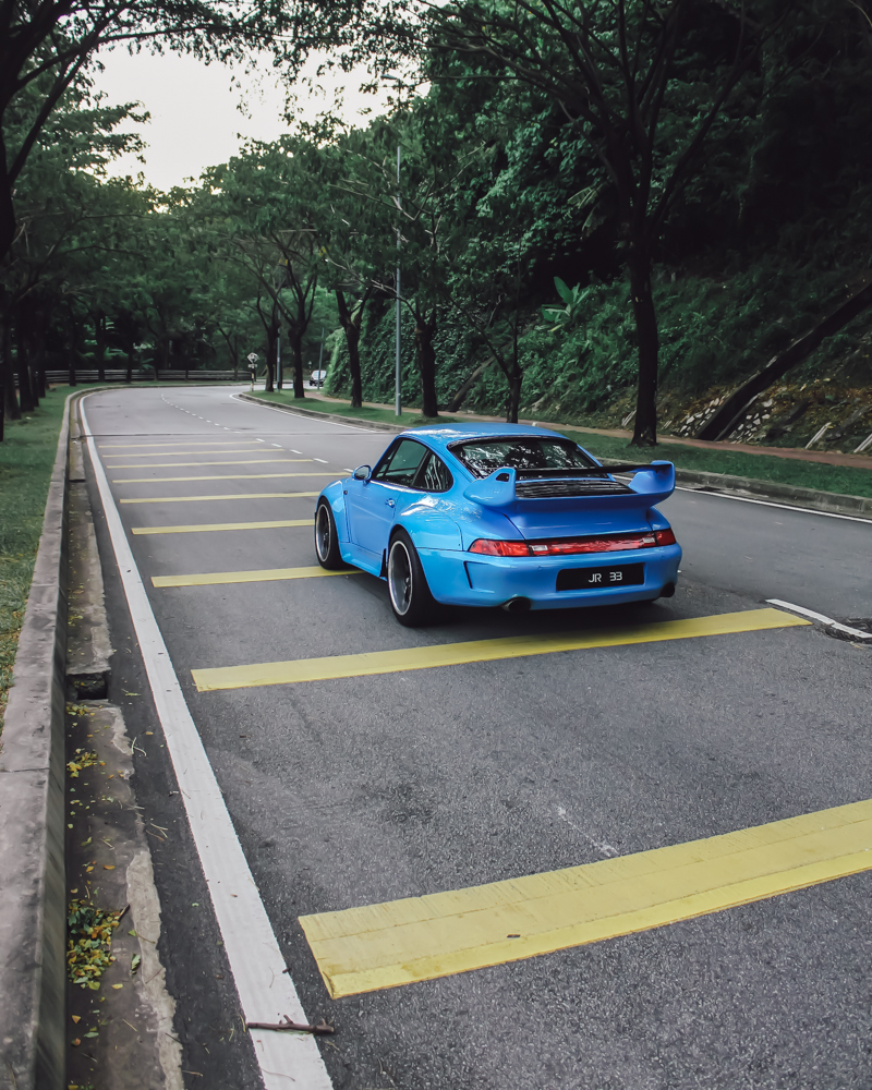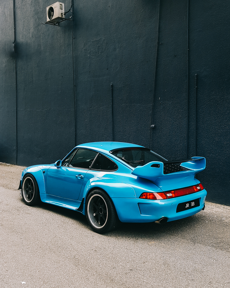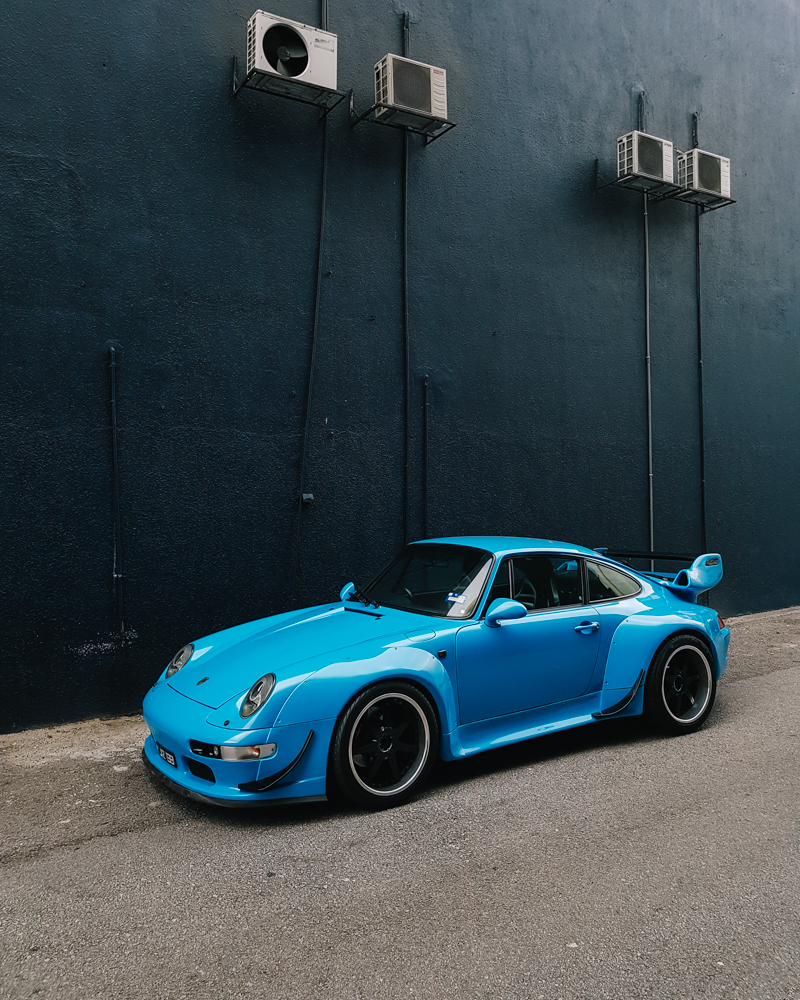 The blue Porsche 911 RWB Evocation was fully done up as an Evocation of a 993 RWB by its previous owner, the car also exhibits a stroker kit bumping it from a 3.6 to a 3.8 and a fully custom ceramic coated exhaust.